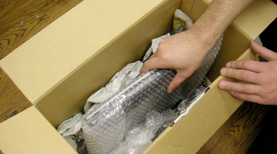 箱の底から、緩衝材⇒商品⇒緩衝材の順につめていきます。開いたスペースには関連商品をつめ放題! -